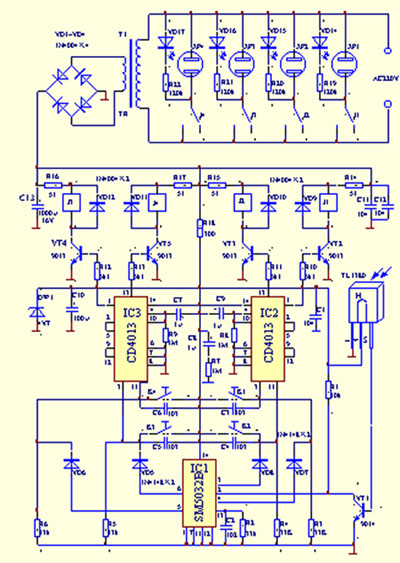 当IC1SM5032B4个非锁存输出端中任何一个只要出现电平的上升沿,对应的双稳态电路的工作状态就翻转一次,即可控制与之相接的三极管的工作状态,如果原是饱和状态,则可变为截止状态;如果原是截止状态,则可变为饱和状态。这就可控制继电器的吸合和释放,实现对受控电器的“开”、“关”控制。
